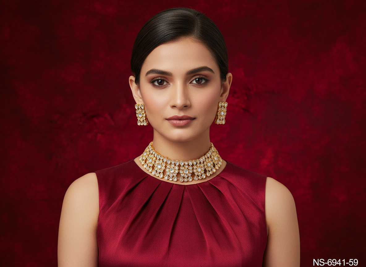 Polki Full Stone Kundan Delicate High Gold Polish Choker Necklace Set
